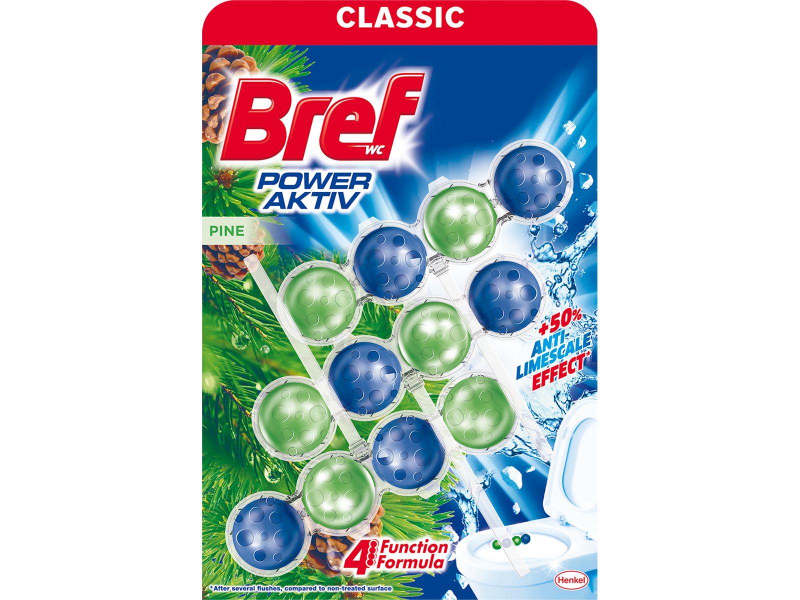 Bref WC POWER AKTIV CLASSIC osveživač, sadrži 4 efikasna sastojka za čišćenje WC šolje, pruža zaštitu od formiranja kamenca, daje blistavost i svežinu WC šolji. Bref WC POWER AKTIV CLASSIC ostavlja higijenski čistu i svežu WC šolju nakon svakog ispiranja.